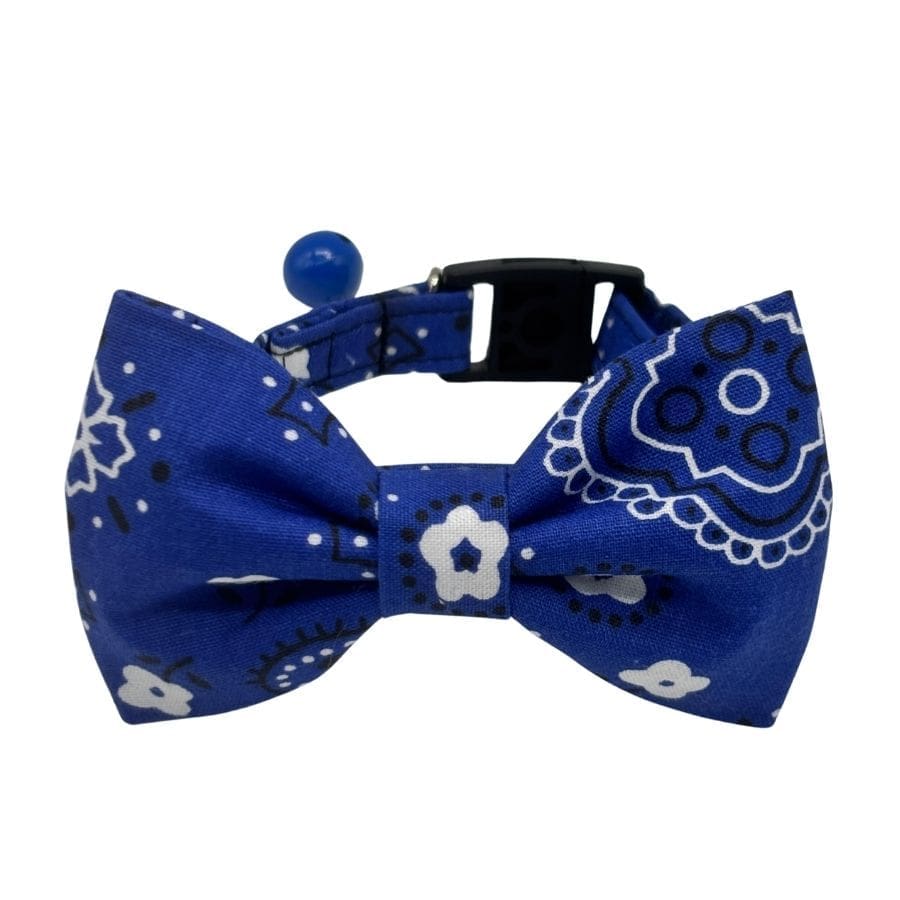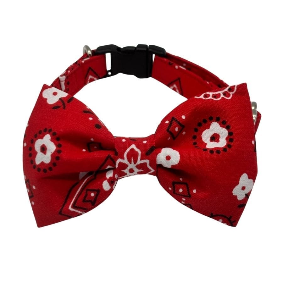 Bold, classic, and undeniably charming — the Bandana Bowtie Collar for Dogs and Cats brings iconic bandana print energy to your pet’s everyday look. Available in rich red or vivid blue, this handcrafted collar features a cotton blend bandana print with white floral and paisley details that give it a timeless, Western-inspired flair. Paired with a removable oversized bowtie in matching fabric, this collar is the kind of boutique-chic piece that makes every walk feel like a style moment worth celebrating.