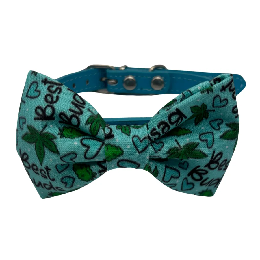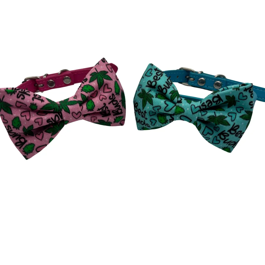 The Best Buds Bowtie Collar for Little Dogs or Cats is a total vibe for your furry fashionista. Whether your pet is more chill than a cucumber or full of playful zoomies, this fun and fabulous bowtie collar adds a splash of personality and color. With a cannabis-themed print that reads “Best Buds” surrounded by leafy greens and sweet little hearts, this collar is made for pets with big style in small bodies!
