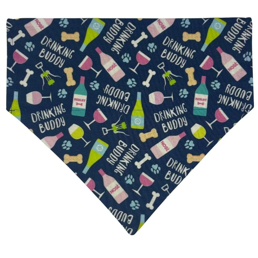 Raise a paw to happy hour style with the Drinking Buddy Over the Collar Bandana — a playful toast to pups who know how to party. With colorful wine bottles, paw prints, dog bones, and cheeky “Drinking Buddy” slogans scattered across a rich navy background, this bandana is designed for dogs who are the life of the paw-ty. Whether you’re wine tasting on the terrace or having a cozy night in, this accessory brings a splash of personality to every occasion.