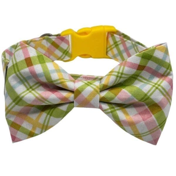 Spring has officially arrived — and your pup is ready to celebrate in style. The Easter Basket Bowtie Adjustable Collar is a pastel dream come true, featuring a cheerful plaid pattern in soft green, blush pink, buttery yellow, and sky blue on a crisp white background. It’s the kind of look that makes strangers stop mid-stride just to gush over your dog, and honestly? We planned it that way.