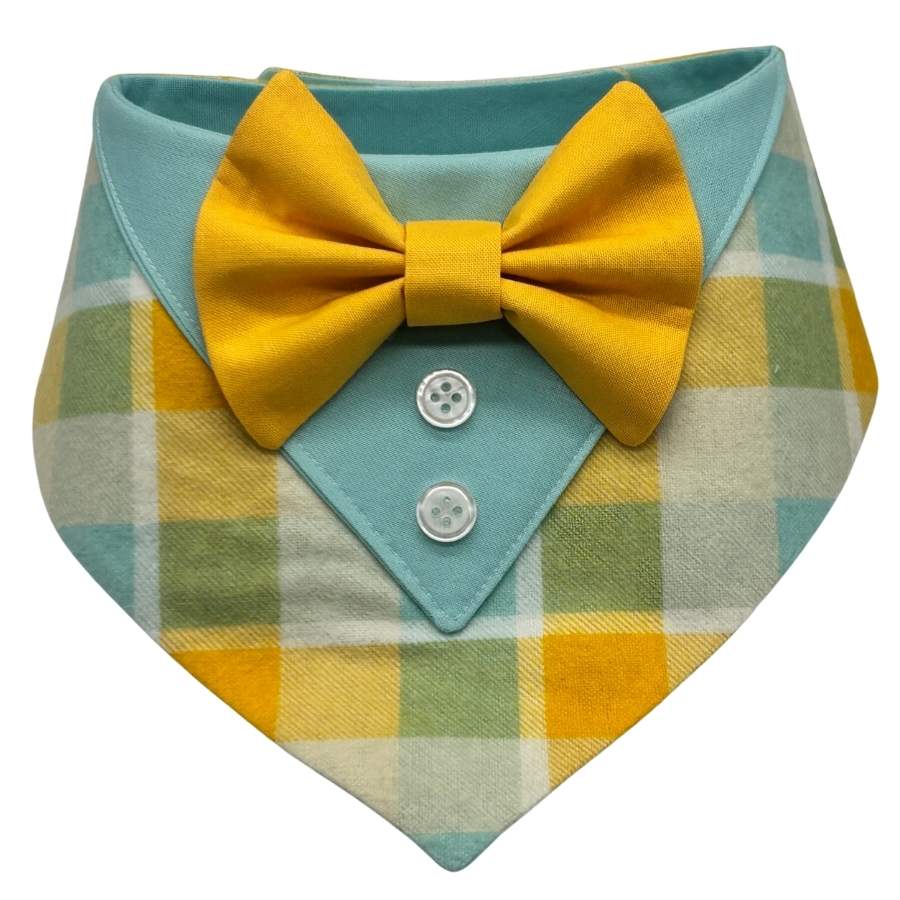 Two styles, one stunning plaid — this bandana was designed to delight. The Tuxedo style features a bold yellow bowtie, an aqua collar panel, and charming decorative buttons for a dapper, dressed-up look. The Ruffled style brings the glamour with a blue satin ruffle trim and a teal chiffon flower finished with a pearl and rhinestone center that catches every bit of springtime light.
