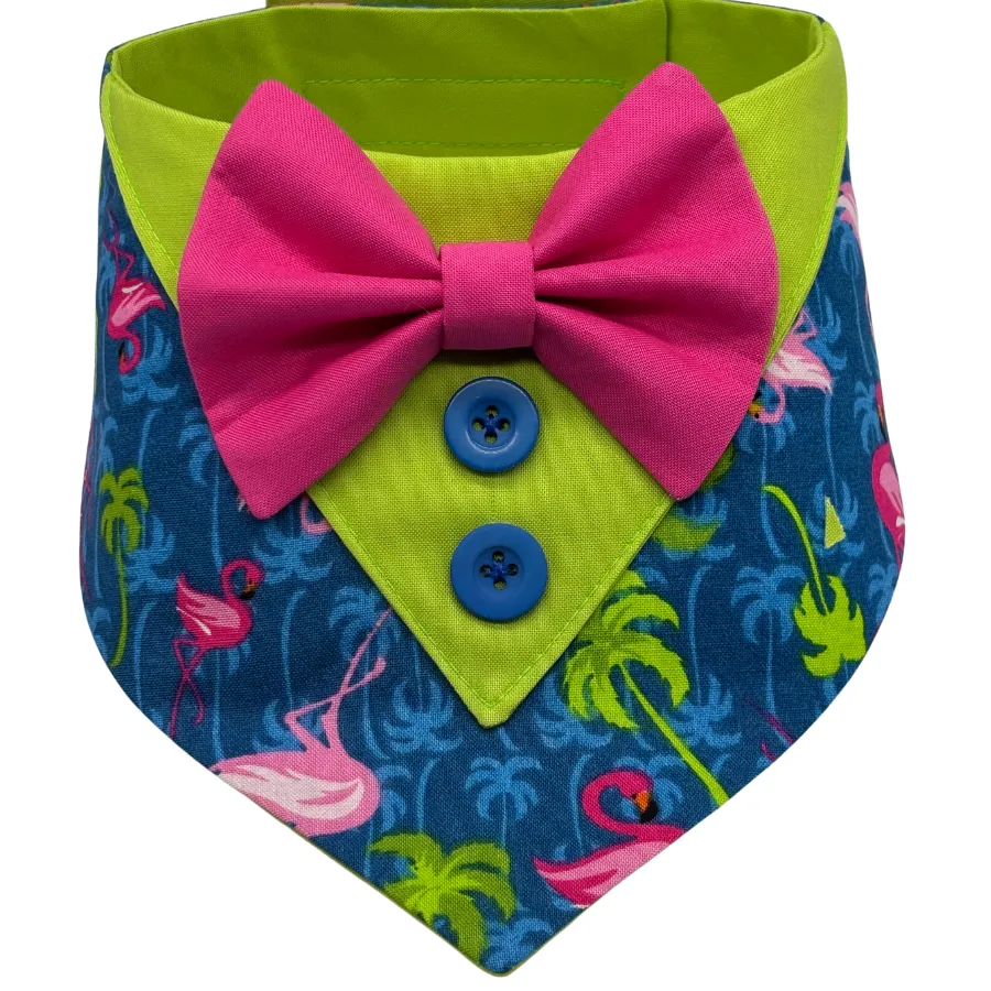 When your pup shows up in the Flock Star Tuxedo Bandana, there’s no competition—this dog’s the life of the paw-ty. Bright pink flamingos, leafy greens, and a sunny vibe give this handmade piece a tropical twist that screams “I woke up like this—fabulous.” Whether your floof is beach-bound or backyard-party-ready, this look is all about bold charm and breezy sophistication.