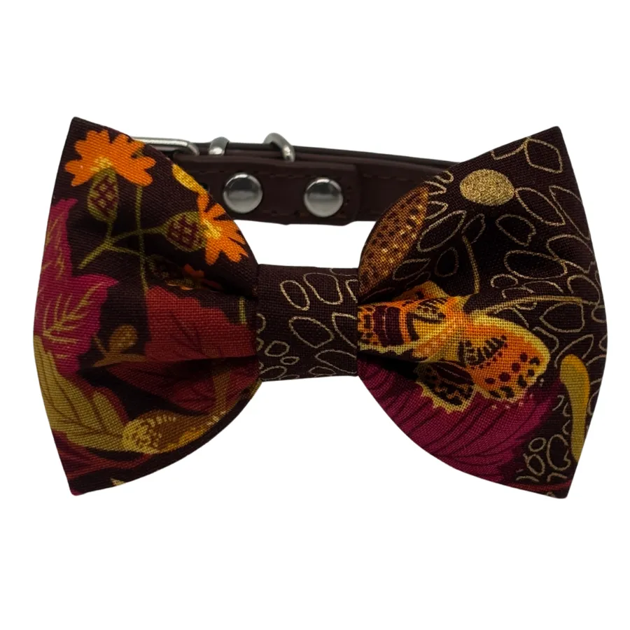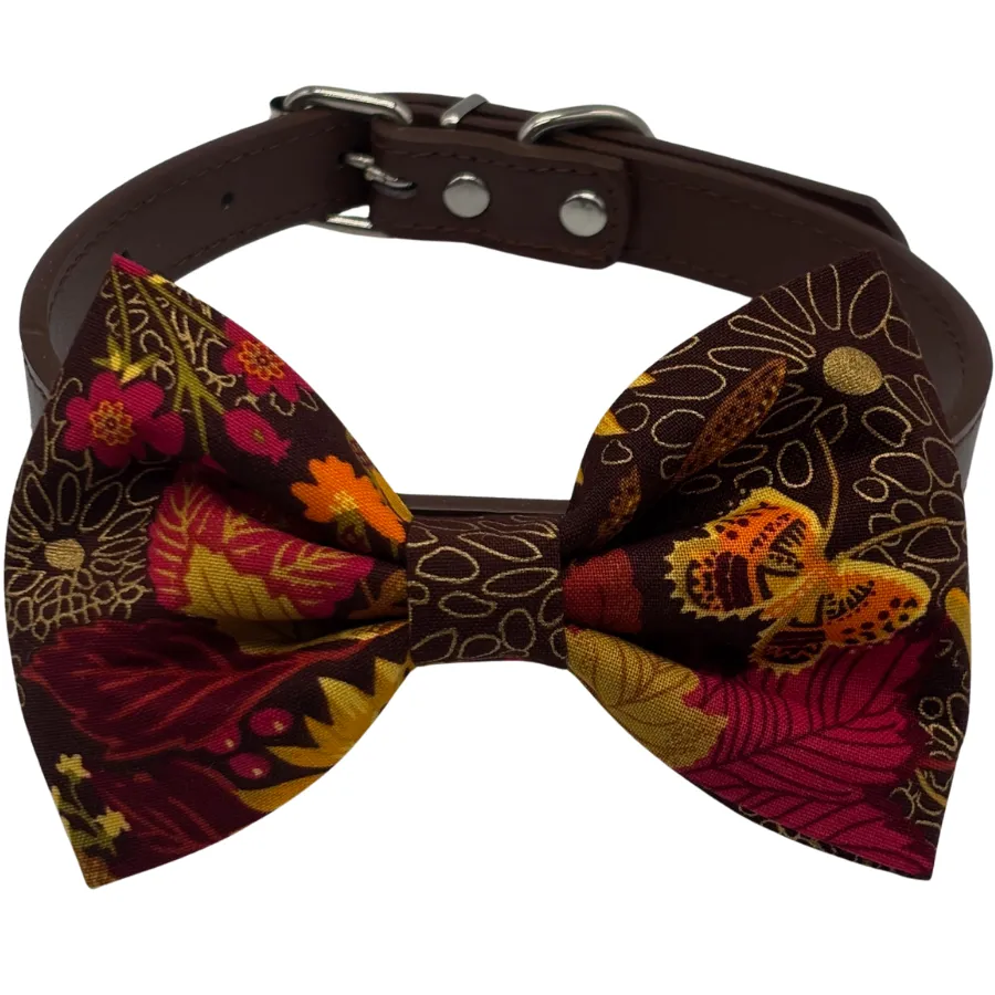 This versatile piece is designed with durability and elegance in mind. The faux leather strap provides a polished base with easy buckle adjustability, while the bowtie adds a festive pop of color that can be removed at any time. Handcrafted with seasonal detail, the print features golden blooms, fluttering butterflies, and autumn leaves that radiate cozy warmth.