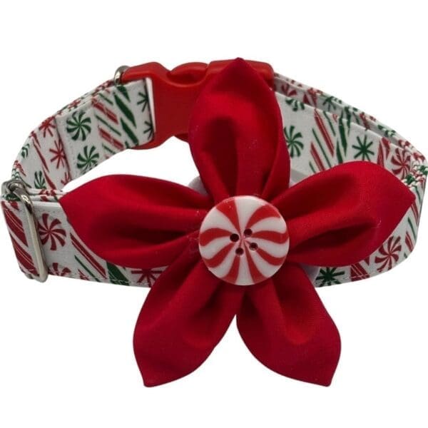 Each collar features a playful peppermint motif paired with a vivid red flower, accented by a swirled button center that looks good enough to eat (but please don’t). Best of all, the flower is completely removable, giving you two looks in one — go bold for the holidays or minimalist for everyday elegance. Pair it with a seasonal leash or a cozy sweater for an extra pop of festive fun.
