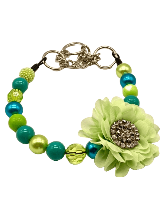 This Lime and Teal Beaded Dog Collar is the ultimate statement piece for the pup who’s not afraid to shine. With a bright blend of bold teal and lime green beads, this martingale-style collar combines fashion and function like no other. A sparkling rhinestone center decorates the soft lime fabric flower, making every walk feel like a red carpet moment.