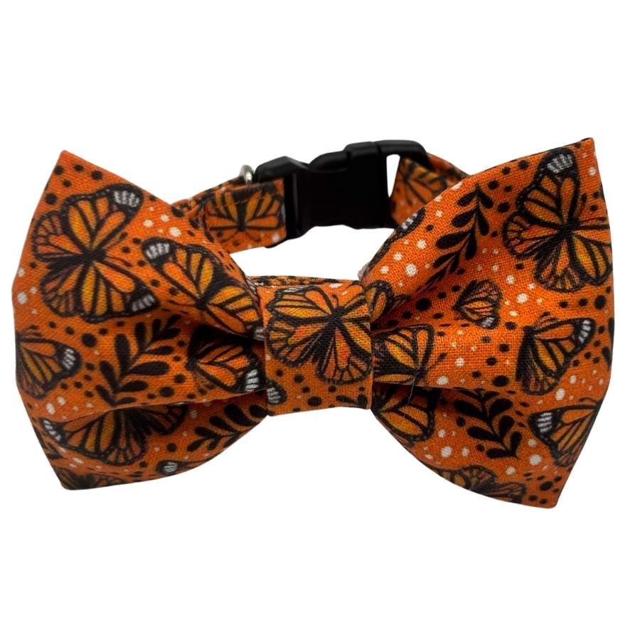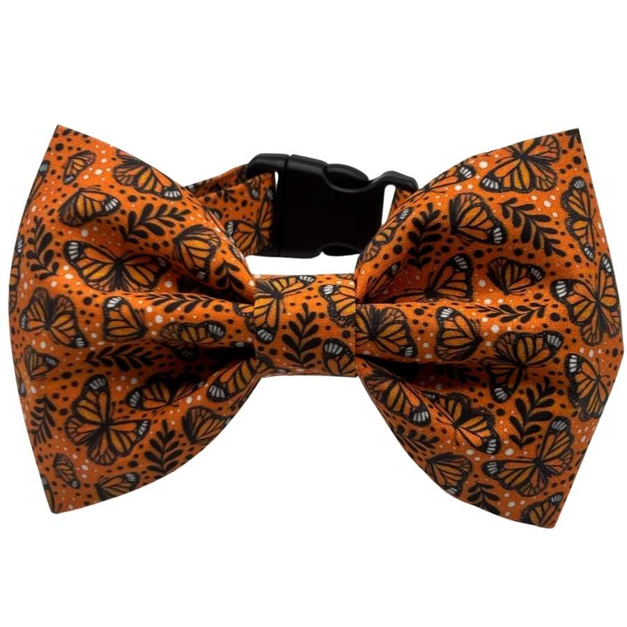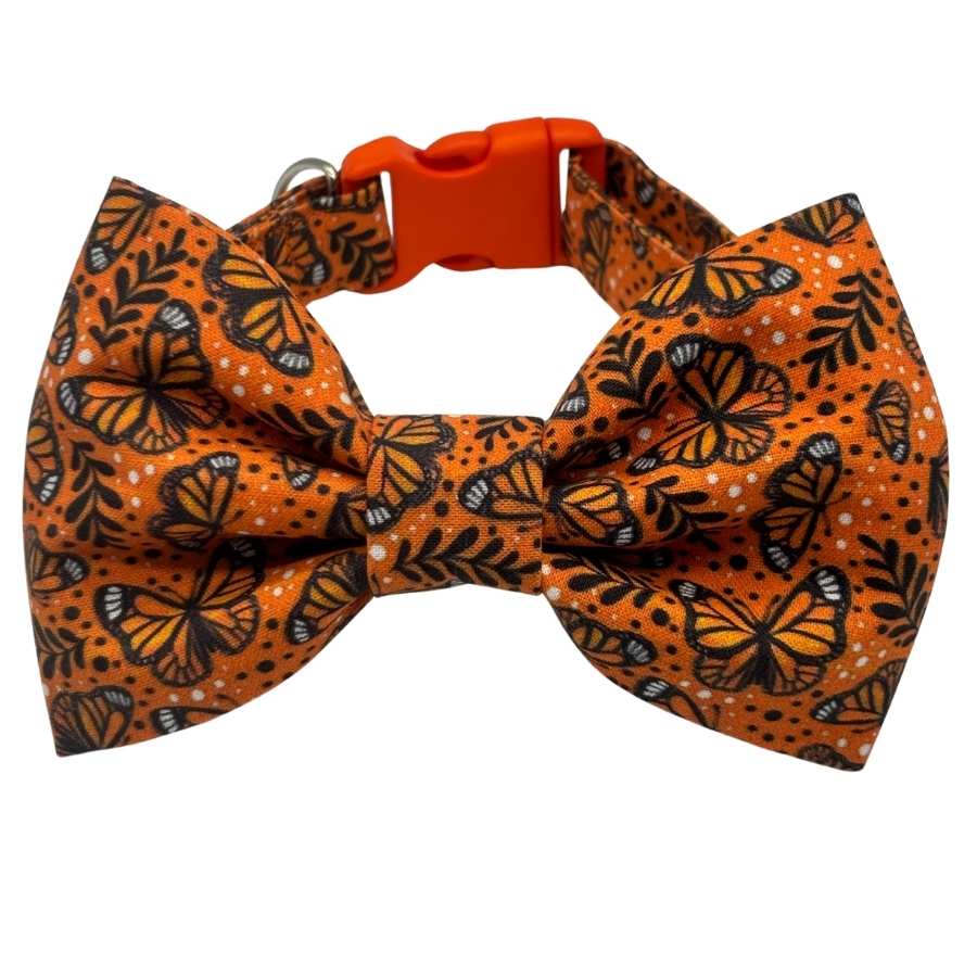 Bold, playful, and full of seasonal charm, the Monarch Flutter Bowtie Adjustable Orange Collar is designed to make your pet stand out with confidence. Featuring a vibrant orange background accented with an elegant monarch butterfly pattern, this collar blends eye-catching color with whimsical detail for a polished, boutique-ready look.