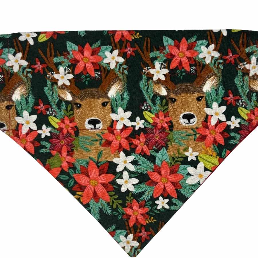 Step into a winter wonderland with the Reindeer Garden Over the Collar Bandana — a festive bloom of holiday charm. This one-sided accessory is where woodland whimsy meets Christmas couture, with a striking forest green backdrop, rich poinsettias, and the sweetest embroidered deer faces peeking through a flurry of blooms. It’s a floral fête made for holiday hosts, cozy car rides, and boutique-style photo ops.