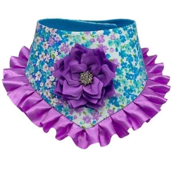 Pretty, playful, and utterly bougie — the Violet Bloom Ruffled Velcro Bandana is the kind of handmade accessory that stops people in their tracks. Featuring a dreamy ditsy floral print in blue, teal, purple, and white on a crisp cream background, this velcro bandana is trimmed with a lush purple satin ruffle and crowned with a stunning layered purple flower and sparkling silver rhinestone center. Whether it’s a spring stroll, a birthday celebration, or just a Tuesday that deserves some extra glam, your pup will be the best-dressed dog in the park.