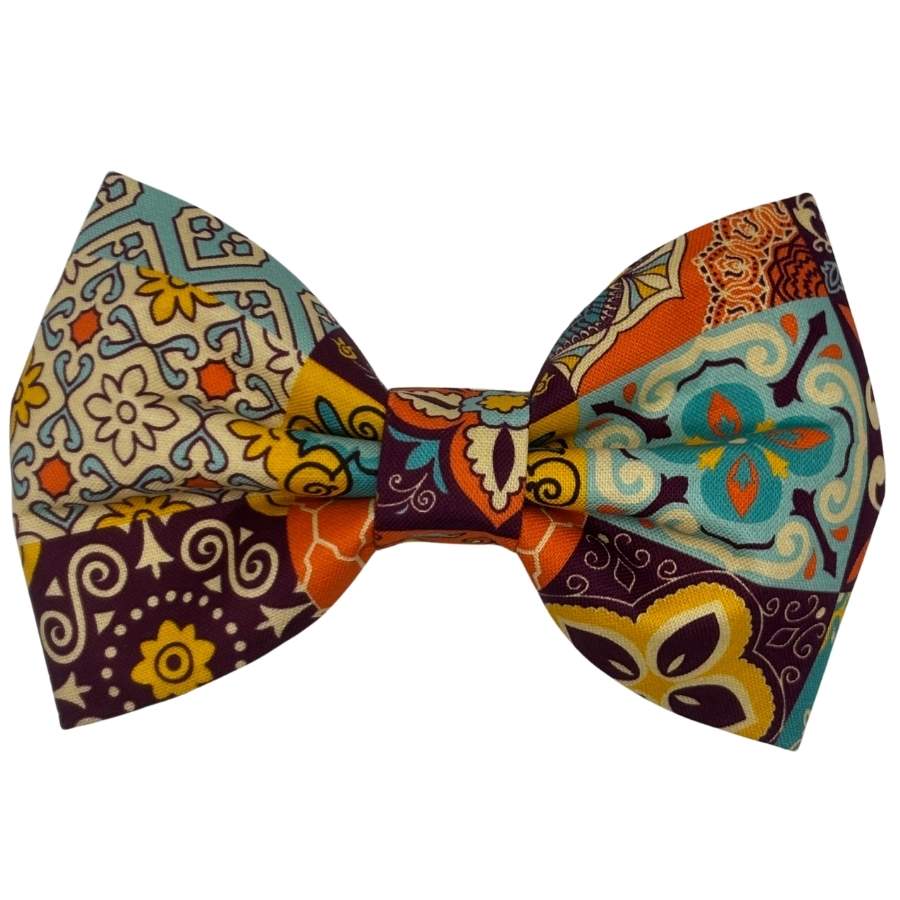 Free-spirited, bold, and utterly one-of-a-kind — the Wanderlust Boho Dog Bowtie is here to take your pup’s style on an adventure. This eye-catching bowtie features a rich patchwork of boho-inspired mosaic tiles in deep plum, burnt orange, golden yellow, and teal, all swirling together in an intricate pattern that looks like it was pulled straight from a world market bazaar. Whether your dog is a laid-back wanderer or the life of every pawty, this bowtie makes a statement without saying a single word.