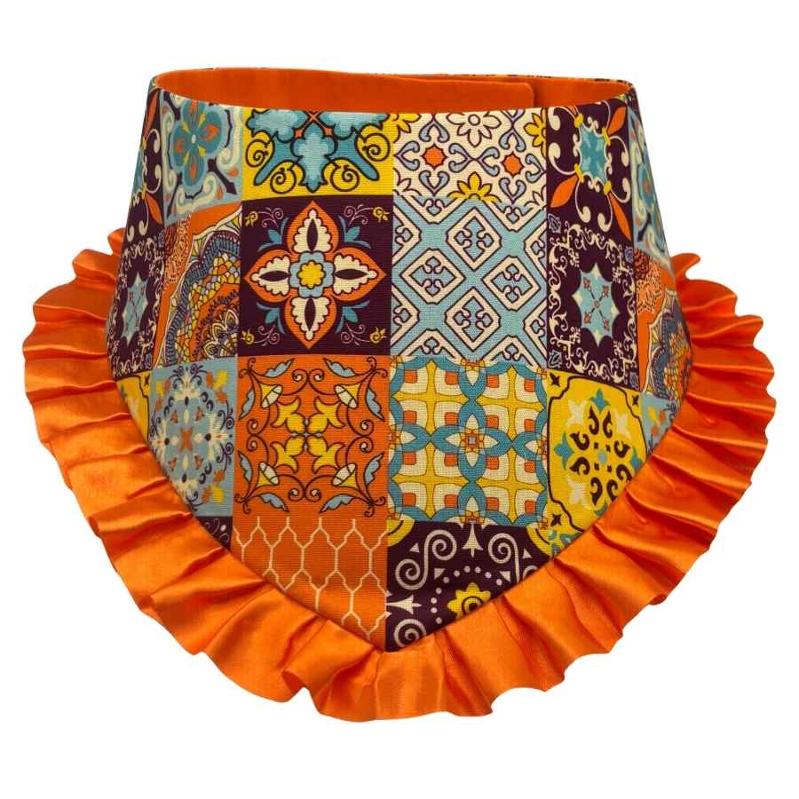 Handcrafted with care in Virginia, USA, this bandana is made from a soft cotton blend fabric that is gentle against your dog’s coat and comfortable for all-day wear. The boho mosaic print fabric is vibrant and detailed, with each tile panel showcasing a unique ornamental design. The orange cotton backing adds a rich pop of warmth that ties the entire look together beautifully.